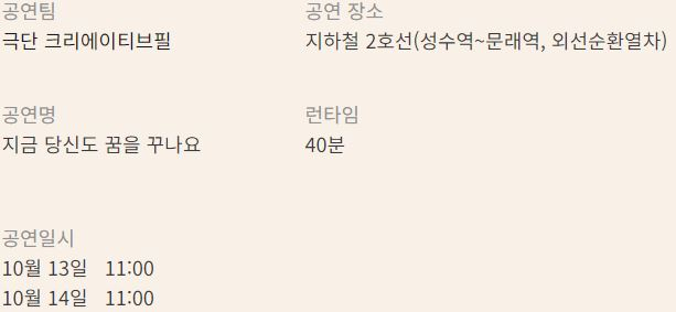 11:00 | 지금 당신도 꿈을 꾸나요(40”)* | 극단 크리에이티브필 | 지하철 2호선 (성수역~문래역) |