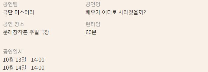 14:00 | 배우가 어디로 사라졌을까?(60”)* | 극단 미스터리 | 문래창작촌 주말극장 |