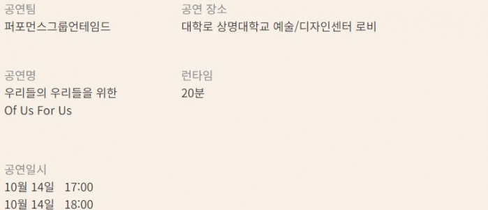18:00 | 우리들의 우리들을 위한 (Of Us For Us)(20”)*** | 퍼포먼스그룹 언테임드 | 대학로 상명대학교 예술·디자인센터 |