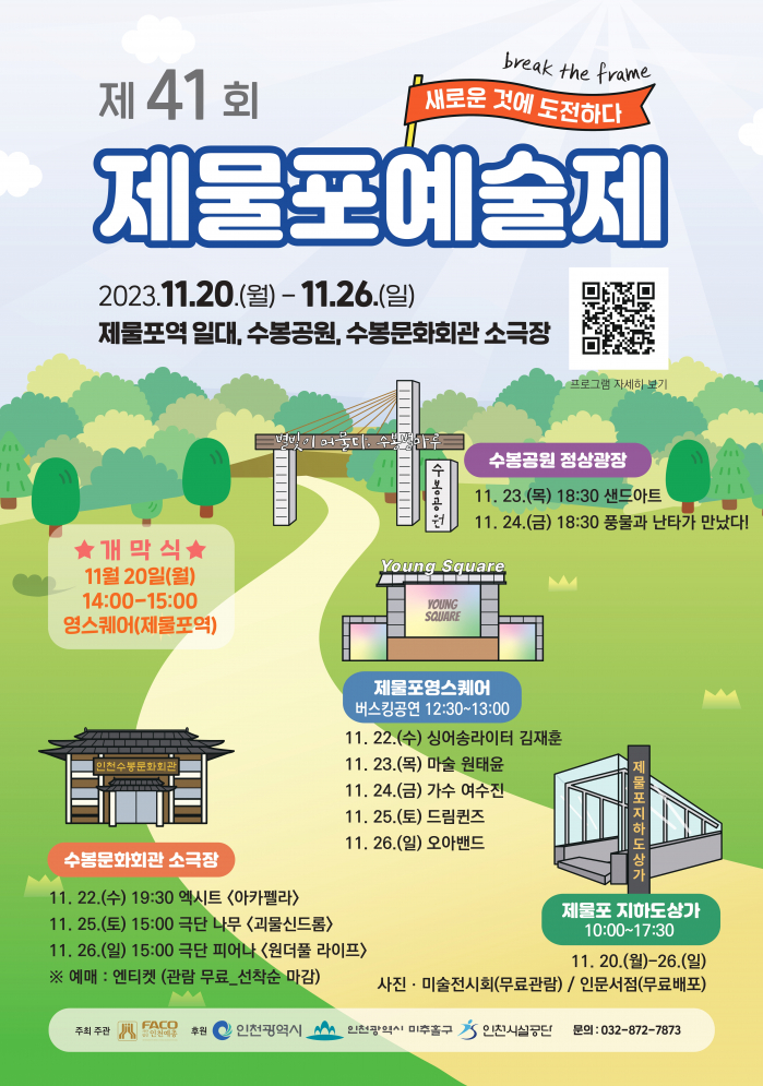 제물포역 앞 영스퀘어, 제물포지하상가, 인천수봉문화회관의 소극장, 수봉공원 등 다양한 장소에서 공연, 전시, 인문예술 등이 나뉘어 진행된다. 관람은 모두 무료이며, 제물포지하상가에