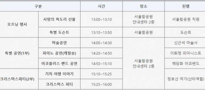 다채로운 빛 조형물과 보기만해도 설레는 아기자기한 소품들이 가득한 ‘로맨틱 한강 크리스마스 마켓’, 크리스마스 마을로 변신한 서울함에서 만나는 특별한 공연 ‘서울함공원 크리스마스 여행’, 가장 가까운 곳에서 만나는 가장 신나는 겨울 ‘한강공원 눈썰매장’ 등! 연말연시의 두근거림과 기대를 담은 선물같은 프로그램들이 한강공원을 가득 채웁니다.