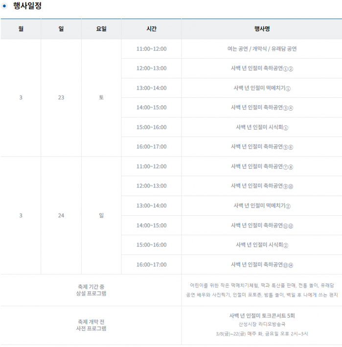 내용 : 사백 년 인절미의 유래를 담은 뮤지컬 ‘라오너스’ 공연, 떡메치기, 떡 시식회, 떡 경연대회 등