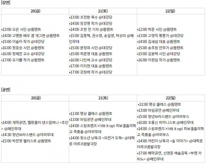 어린이들을 위한 다양한 체험 부스, 3일간 이어지는 20여회의 인문 강연 그리고 눈과 귀를 채워줄 공연 등 풍성한 프로그램들로 구성되어 있습니다.