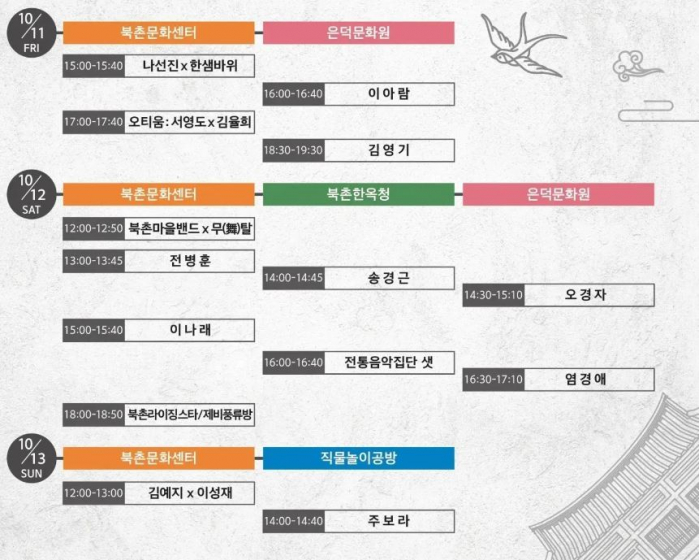 이튿날 10월 12일(토) 정오부터는 ▲북촌마을밴드x무(舞)탈 ▲전병훈 ▲이나래 ▲북촌라이징스타와 제비풍류방 ▲송경근: ‘훈’의 소리 그리고 이야기 ▲전통음악집단 ‘샛’ ▲오경자 ▲염경애의 무대가 펼쳐질 예정이다.