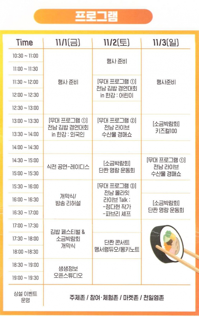 - 식전공연 / 개막식 / 축하공연 / 김밥 경연대회 / 라이브 경매쇼 / 라이브 토크쇼 / 단짠콘서트
