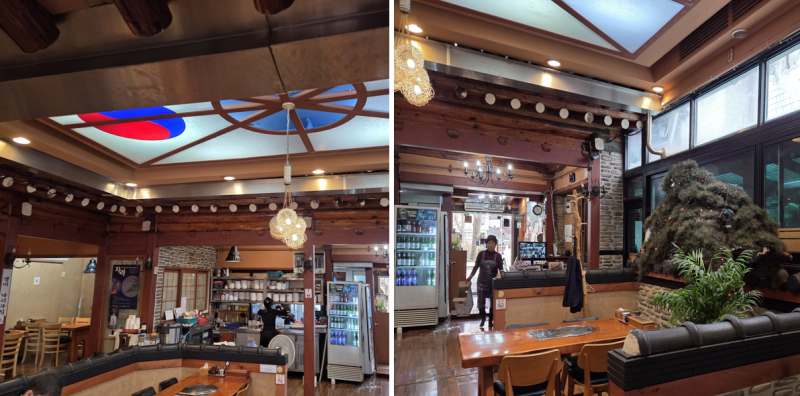 실내 분위기도 한옥집 인테리어와 전통 문양의 벽과 천장 그리고 기와 담장