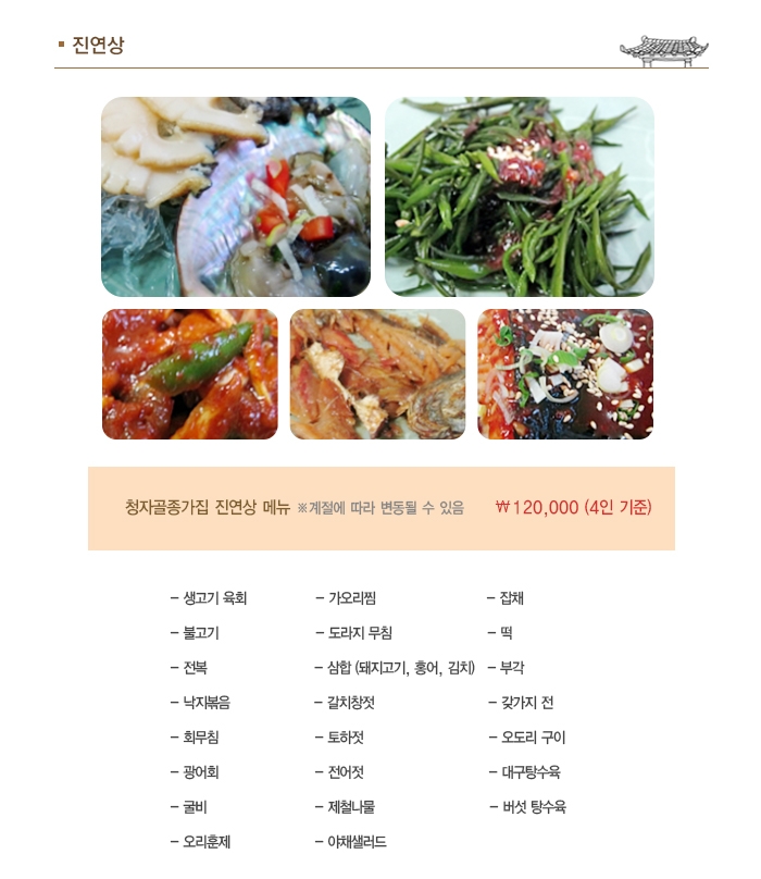4인기준 고베상 200,000원 / 진연상 120,000원 / 수라상 100,000원 등
