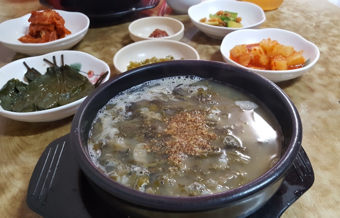 시래기 들어 간 쑥해장국, 청국장, 사철쑥국, 콩나물해장국, 북어국, 인삼모주 김치찌개 ..