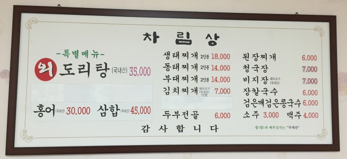 생태찌개 부대찌개 김치찌개 된장찌개 청국장 장칼국수 홍어삼합 두부전골 등 몇 가지 메뉴가 더 있어 선택의 폭이 넓은 편이다.