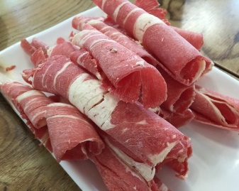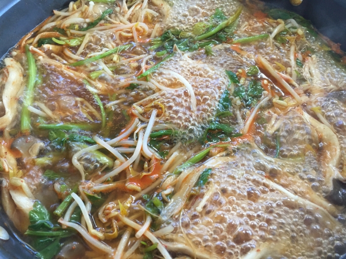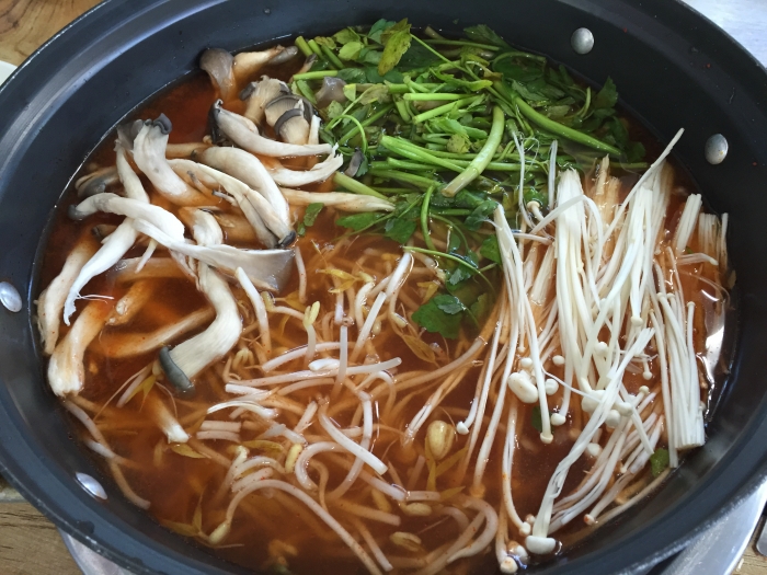 <냄비에 가득 담겨 온 샤부샤부 국물에 야채...