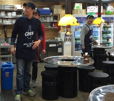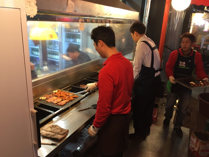 초벌로 닭갈비를 밖에서 열심히 구워서 안으로 공급해 준다. .