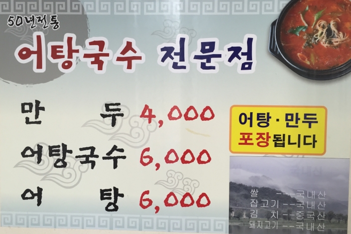 만두 어탕국수 어탕 모두 가격이 저렴하고 어탕과 만두 TAKE-OUT 포장도 해준다.