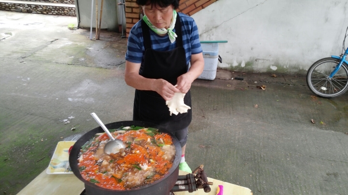 손으로 수제비를 뚝뚝 떼어 넣어주고 그 자리에서 간을 맞춰주고 서빙을 해 준다.