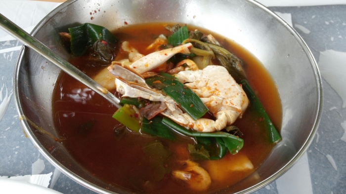 굵은 파 송송, 감자 왕건이 뚜욱~ 게를 잡아 넣어 해물 맛을 더해주고