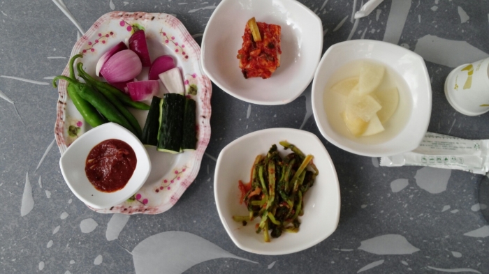 밑반찬도 텃밭에서 직접 기른 오이 고추 상추 무한리필이다.