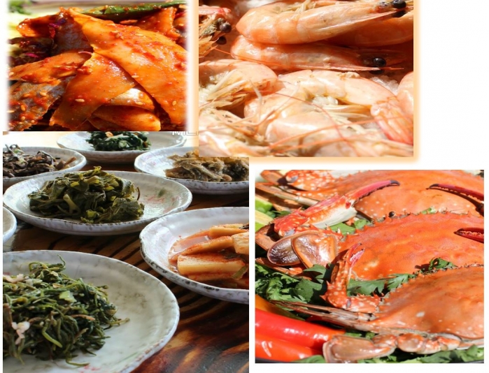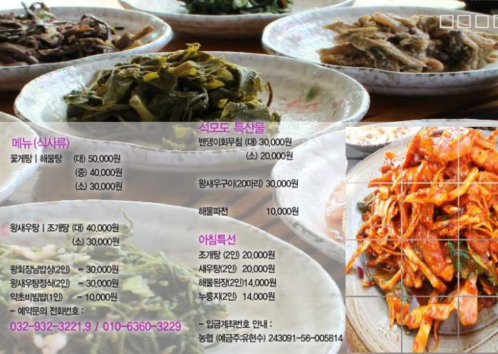 밴댕이회, 꽃게탕, 해물탕,밴댕이무침, 왕새우구이, 파전, 도토리묵, 해물된장 등