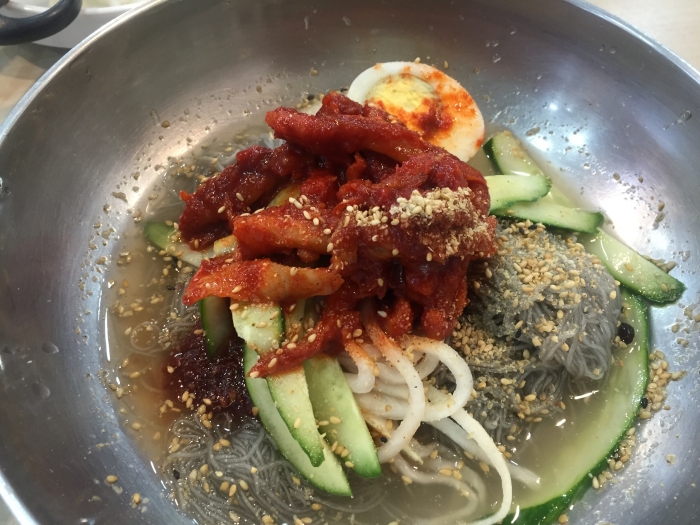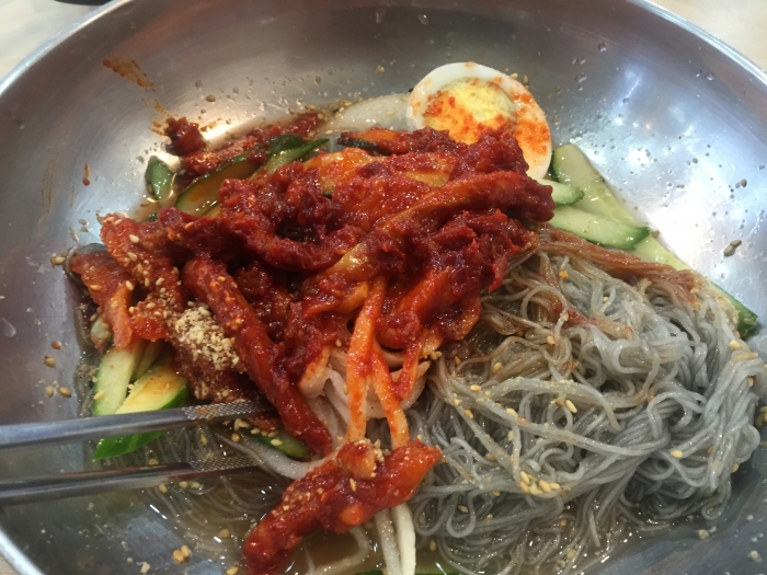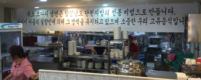 코다리냉면은 물냉면이 아니고 보통 비빔냉면인데이때 황태육수 함께 하면 맛의 색다른 세계로 초대 받는다.