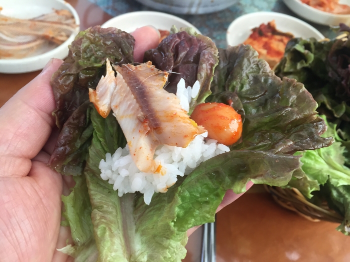 상추에 밥과 마늘 그리고 밴댕이 고기 살점을 얹은 뒤에 쌈을 싸 먹으니 밥도둑이 될 수 밖에..