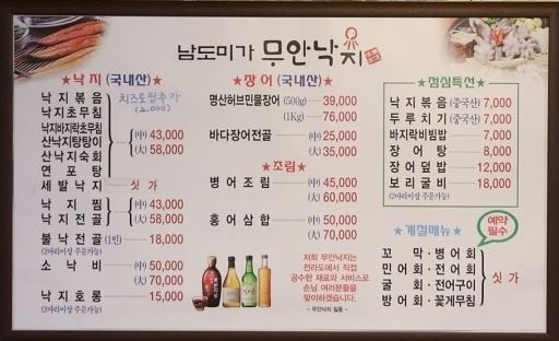 해썹인증 식단으로 다양한 메뉴를 선보인다. 산낙지탕탕이, 홍어삼합, 치즈불낙, 허브민물장어구이, 낙지호롱구이, 산낙지전골, 보리구이..