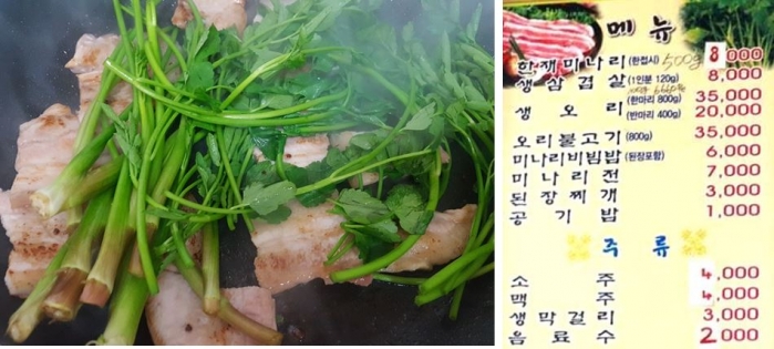미나리 집산지에서 직접 가져온 싱싱한 미나리와 함께 고기를 구워 먹는 집이 여러 곳이 있는데..