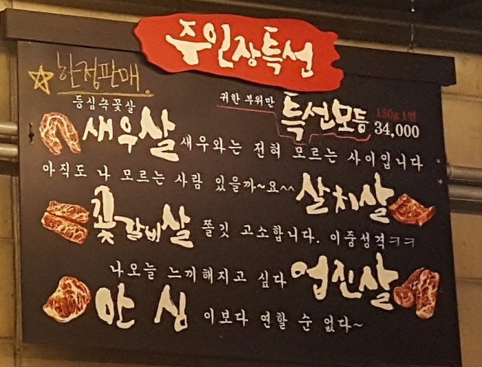 숙성등심이 괜찮은 추천메뉴인데 약간은 값이 나가므로 특 모듬 정도?