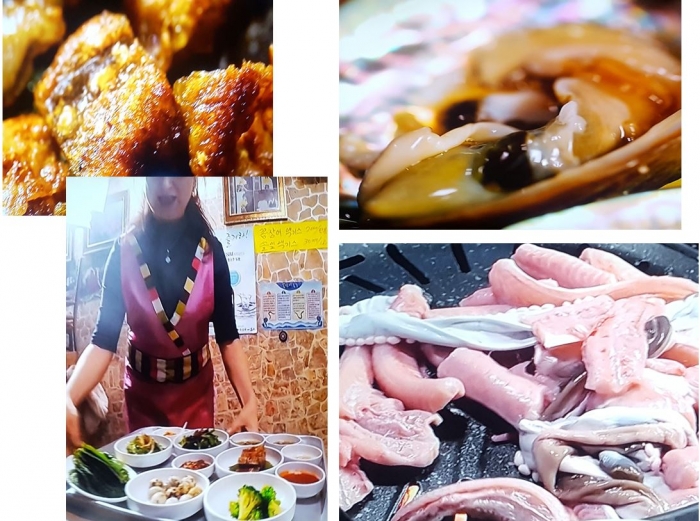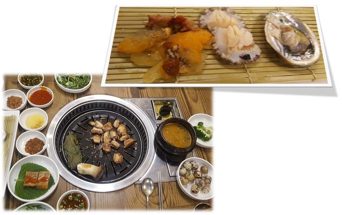 밑반찬에 해산물(전복 멍게 해삼 등)과 야채가 싱싱하여 식사시간의 시작부터 기분이 좋아집니다.