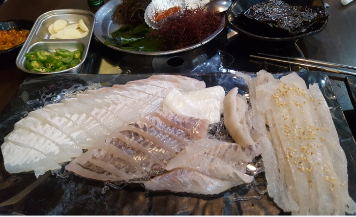 줄회라고 해서 길게 썰어 온 회를 갈치속젓에 찍어 먹는 회 맛이 특이합니다.