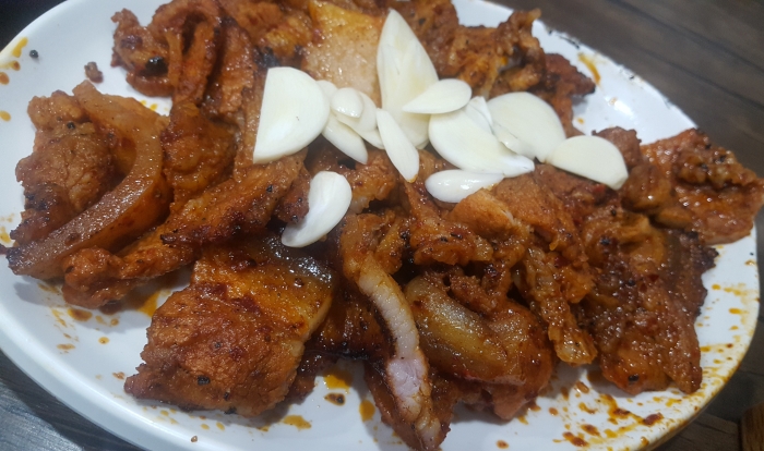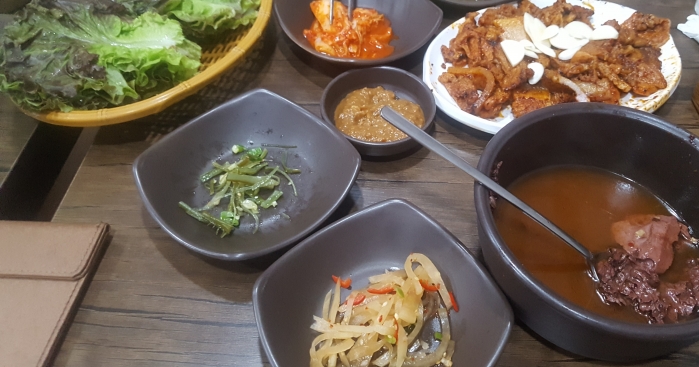 된장도 맛있어서 마늘찍어 연탄삼겹살 함께 쌈을 싸 먹으면..