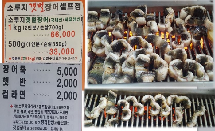 양식장에서 갯벌장어를 직접 기르고 셀프서비스로 장어구이를 즐기는 곳