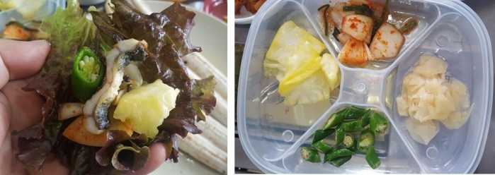 쌈을 싸 먹는데 생강절임 양파무침 양배추 청양고추 된장 간장 ..