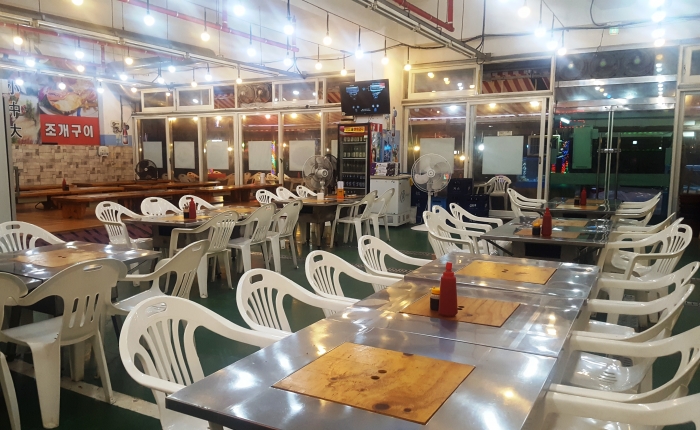 싱싱한 조개구이 전문이라서 모든 테이블에 불판이 있다.
