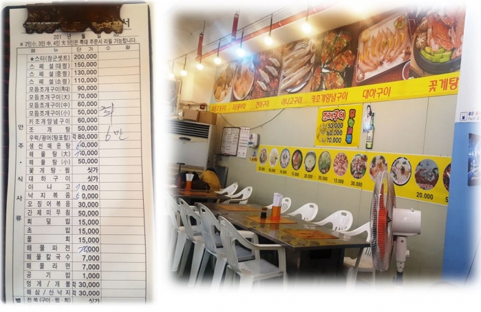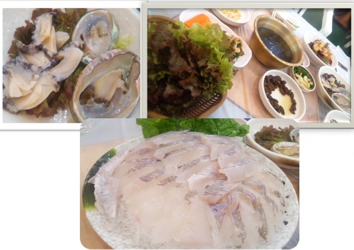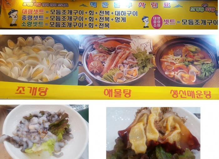 모듬조개구이 생선회 꽃게탕 해물탕 알탕 알밥