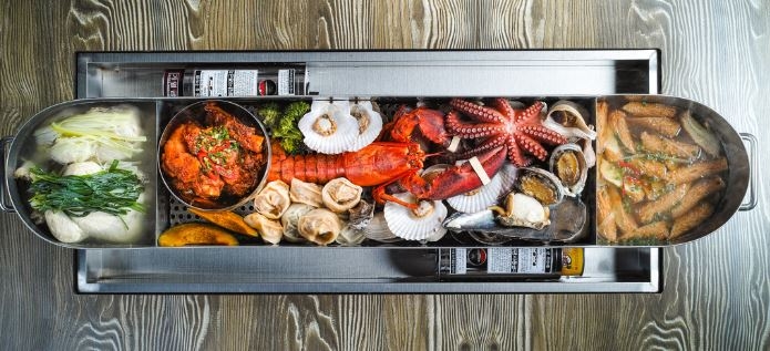 이렇게 긴 냄비에 육해공.. 고기 해산물 해신탕