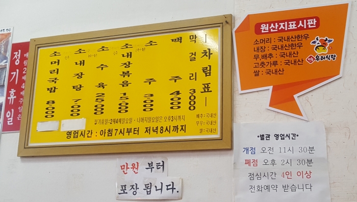 소머리국밥 8000원 / 소내장탕 7000원 / 소 수육 25000원 / 소내장볶음 15000원