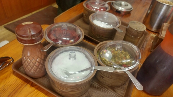 풋고추 절임, 다대기, 들깨가루 등 식성에 따라 골라 넣어 먹는다.