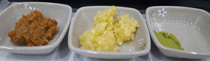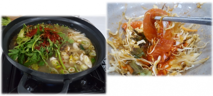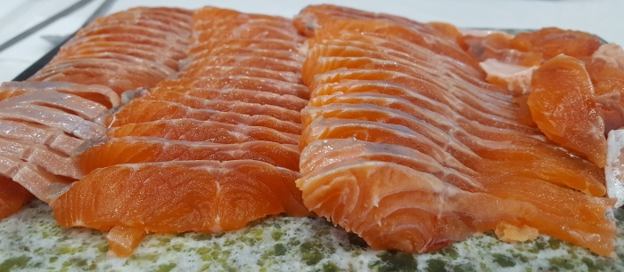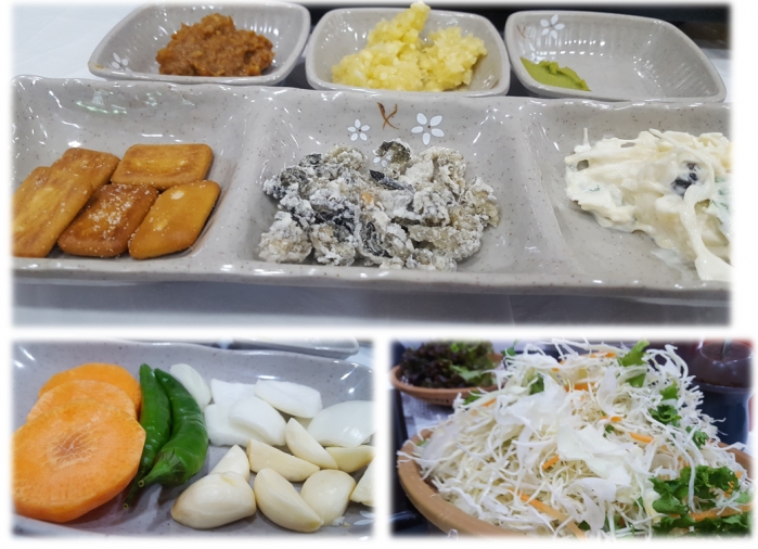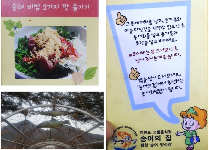 송어회 비빔 = 야채 넣고 콩가루와 마늘 다진 것을 적당히 넣은 뒤에 성어회 넣고 들기름과 초장을 넣고 비빈다. 와사비도 식성에 따라 가미할 수 있다.