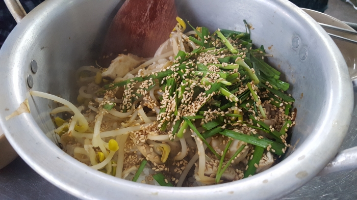 아주 뜨거운 양은냄비에 담아 나오는 약초밥을 비벼 먹는다