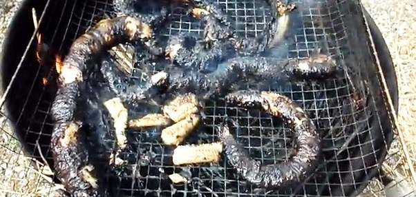 짚풀에 불을 붙여 꼼장어를 굽는 모습 ▲
