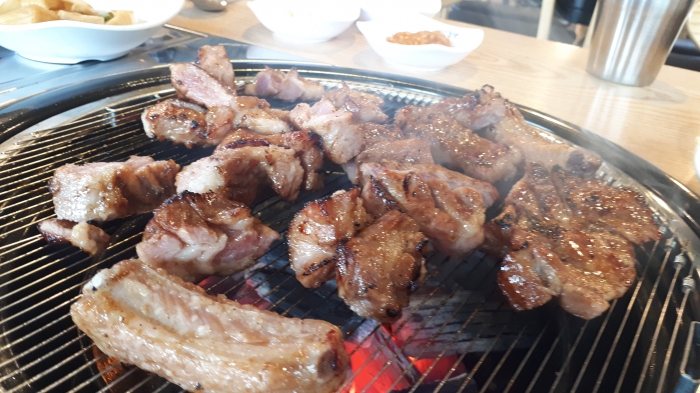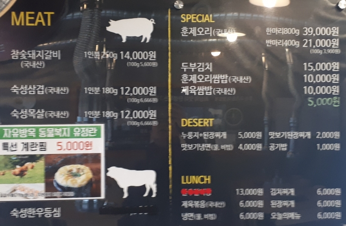 국내산 참숯을 사용하고 숙성된 고기를 초벌의 시어링(searing)을 통해 특유의 육즙과 맛을 자랑한다
