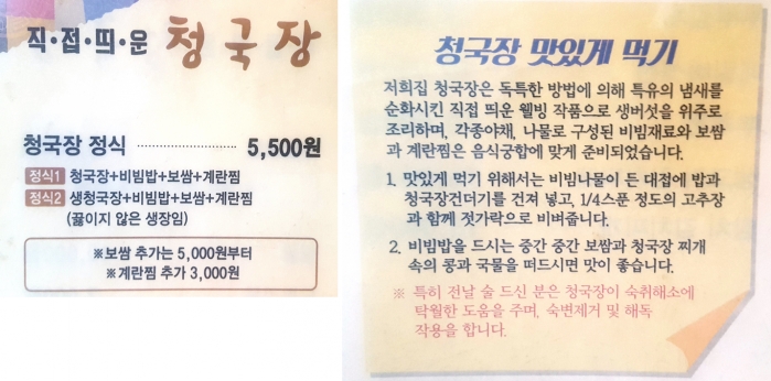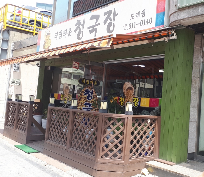 직접띄운 청국장이 상호가 아니다. 도래샘이라는 식당명이 함께 기재되어 있다.