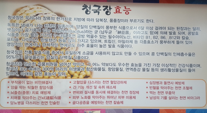 하루에 청국장 한 숫가락만 계속 먹어도 보약이 된다고 하는데, 콩 단백질이 우수하고, 기능성 물질이 많은 반면 냄사개 심한 단점이 있다. 청국장은 몸의 지방이 산화되는 것을 막고 노화를 방지하며 혈전을 녹여주는 효소가 많다. 또 유산균의 작용으로 장을 튼튼하게 하고 시원한 배변을 돕고 섬유질이 풍부해 다이어트 식품으로 웰빙 건강 식품으로 각광을 받고 있다.