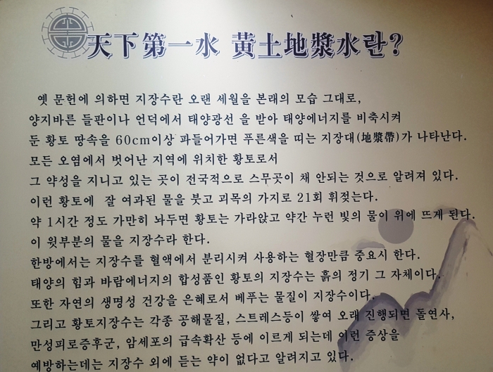 전국에 드물게 있는데 이런 곳의 황토를 가져다가 물을 붓고 괴목의 가지로 21회 휘젓고 흙이 가라안으면 이 물을 떠다가 음식을 한다는 겁니다. 黃土地漿水
