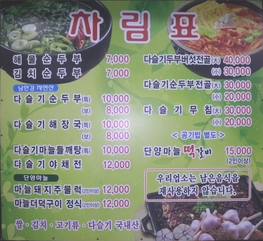 황태해장국 해물순두부 마늘떡갈비 쏘가리매운탕 각종 민물매운탕