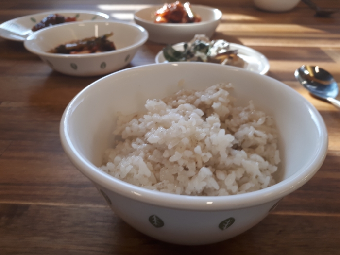 밥이 맛있다. 찰밥인데 푸르스름하다.