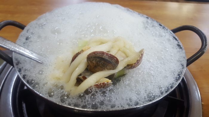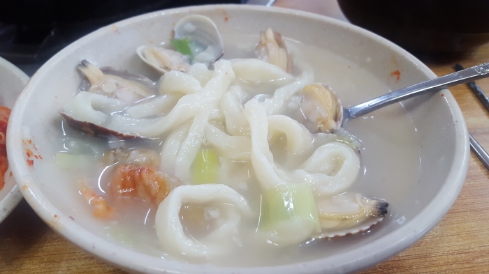 손칼국수가 새우 바지락 해산물 육수와 잘 어울려