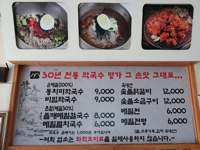 동치미막국수 비빔막국수 들깨메밀칼국수 메밀멸치국수 모두가 명품 입맛을 맞춰줍니다.