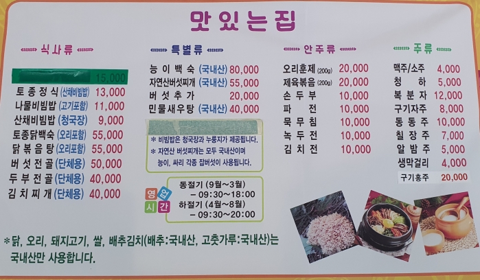 토종정식 산채비빔밥 버섯전골 백숙 닭도리탕 파전 도토리묵