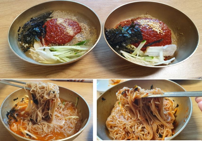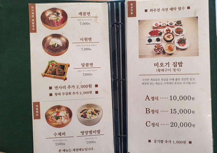 자연 속의 신선함을 더한답니다. 건강한 땅에서 흙의 기운으로 자란 메밀로 만들고 조상의 지혜를 담았다네요. 매콤면과 시원면을 시켜 봤어요.한상차림<미오기집밥>은 하루 전에 사전예약을 해야 한다네요~