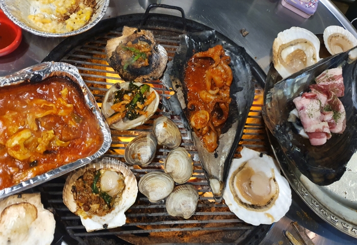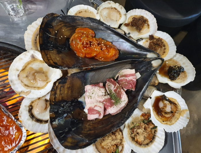 ​베이컨 쪼가리도 아주 부드럽고 맛있고 양념낙지도 먹을만 합니다. 가리비 그리고 큰 키조개 양념 반반을 시켜 먹어볼 만 합니다. 그리고 쪼맨한 모시조개 같은 것들 언제 다 구어 먹나요? 그냔 벌어지기만 하면 조갯살을 빼서 호일접시 떡볶이 같은 국물에 넣어서 익혀 먹어 보세요. 아주 죽여 줘요~