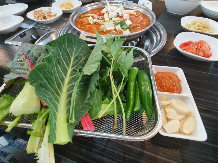 반찬은 셀프서비스니까 계속 가져다 먹을 수 있고,, 쌈도 마늘도 고추도..